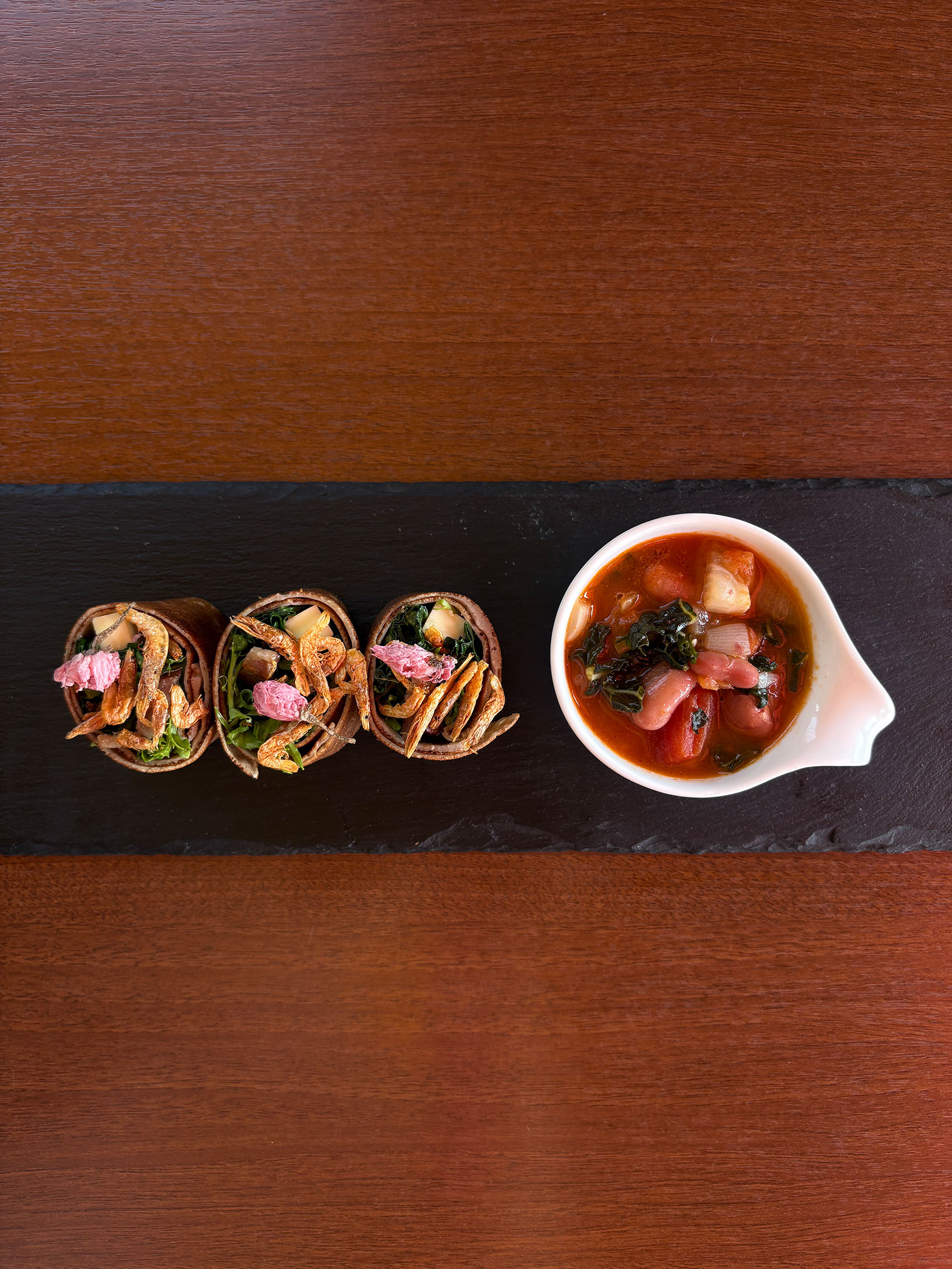 - 桜えびと季節のお野菜のそば粉のガレットロール